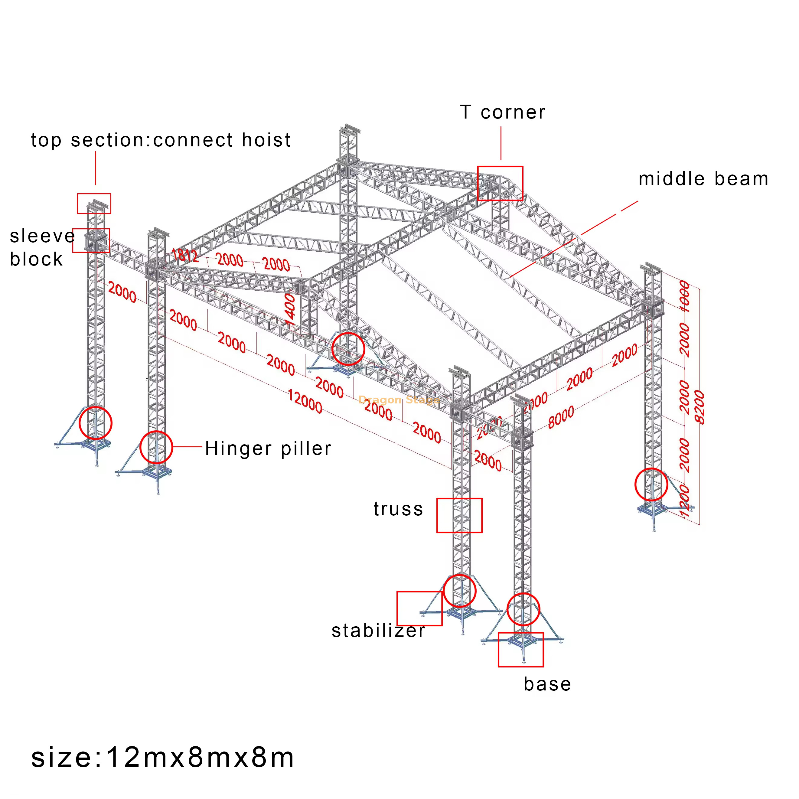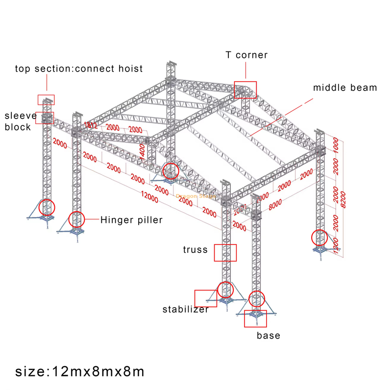 This 12x8x8m system is fabricated from premium 6082-T6 aluminum alloy, offering superior tensile strength and excellent resistance to environmental corrosion (Source:https://www.dragontruss.com/Aluminum-Truss-System-pd413987768.html). This ensures the structure remains a safe and professional asset for years of continuous use.