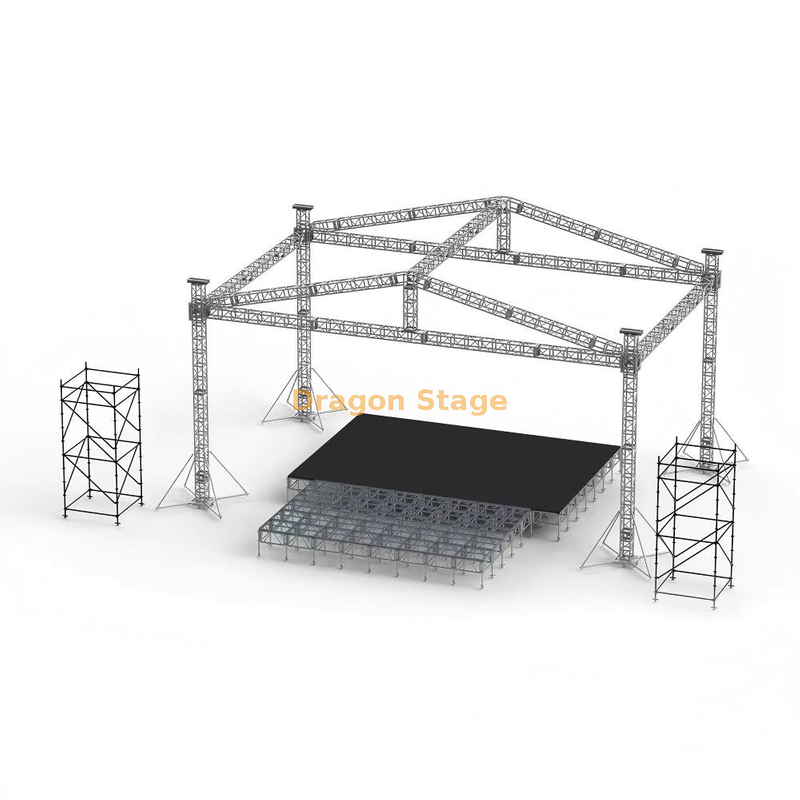 To provide a complete venue solution, this pyramid roof is designed for seamless integration with our modular aluminum stage platforms. These decks feature 18mm anti-slip surfaces and high load-bearing capacities, creating a professional and secure foundation for performers beneath the massive overhead rig (Source:https://www.dragontruss.com/Aluminum-Stage-Platform-pd463987768.html).