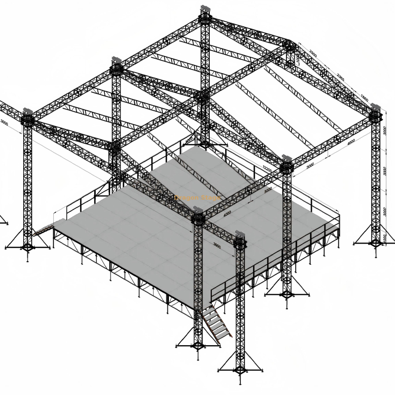 Premier 14m x 14m outdoor triangle roof truss system standing 10m high. Features a reinforced 4-pillar ground support design, dual 3m wide speaker wings, and a high-capacity pitched roof. Engineered for large-scale outdoor festivals, concerts, and major events requiring massive vertical clearance and superior weather protection.