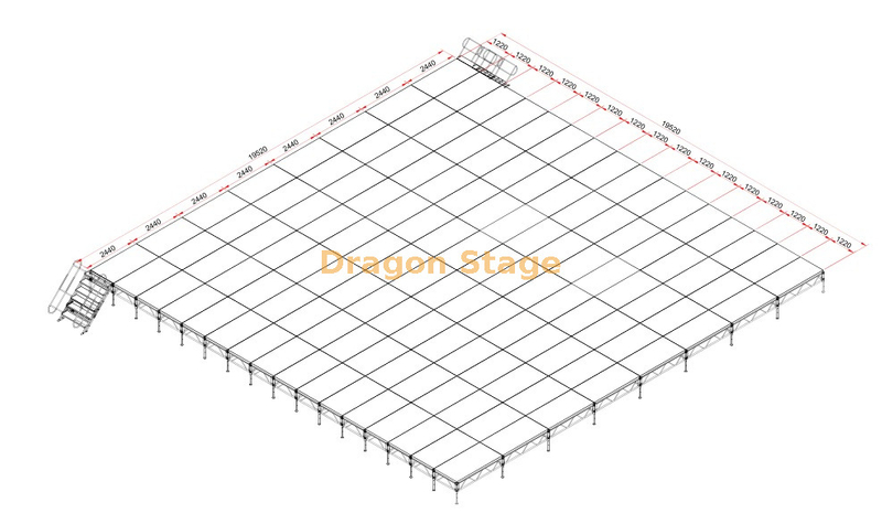 This expansive 19.52 m x 19.52 m aluminum stage system delivers a rock-solid, fully modular performance platform, perfect for major concerts, festivals, outdoor ceremonies, and large corporate events. Constructed using standard 1.22m x 2.44m (4ftx8ft) weatherproof stage decks with aluminum frames and plywood tops, supported by genuine legs (adjustable height 0.4–2.0m typical), it offers exceptional load capacity and rapid assembly.