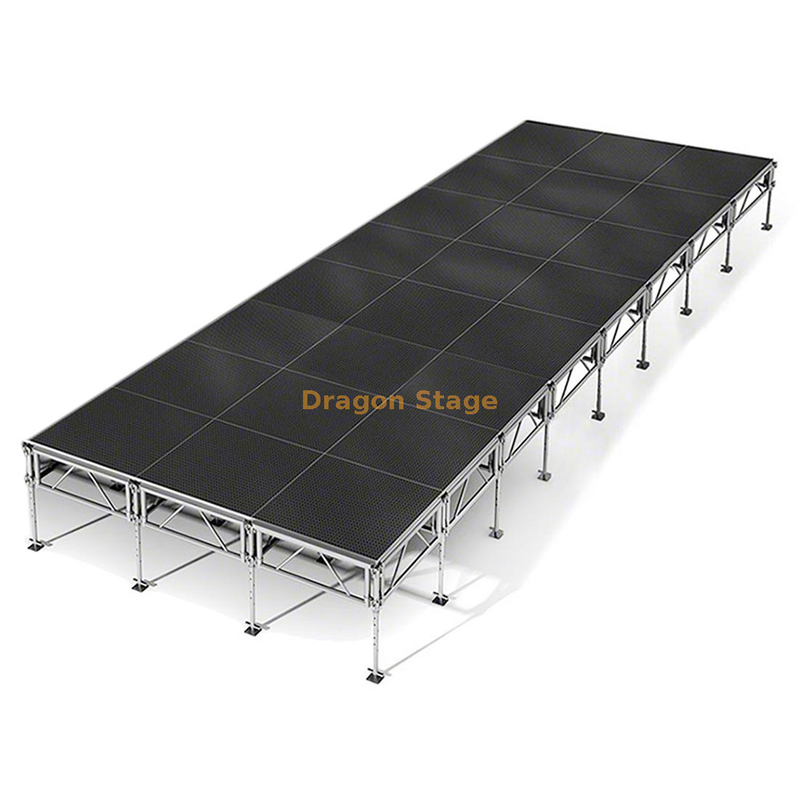 The adjustable legs allow for leveling on uneven terrain, providing a stable foundation for the stage.