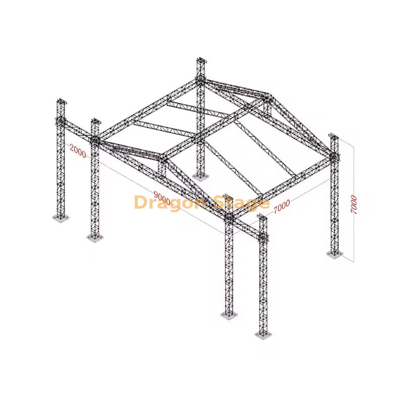 For regional festival organizers and production rental houses, the ability to deliver a "big-stage" audio-visual experience within a compact footprint is a major competitive advantage. The 9x7x7m Peak Roof Truss System by DragonStage is engineered to provide a high-capacity rigging environment with a sleek, professional profile. Featuring a 63-square-meter covered area and a commanding 7-meter vertical clearance, this system is optimized for mid-sized concerts and corporate activations. The integration of dual 2-meter speaker wings allows for the suspension of professional line arrays outside the main performance area, ensuring clear sightlines and superior acoustic coverage for the audience.