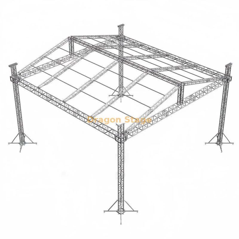 The system is topped with a heavy-duty, fire-retardant PVC canopy that features a pitched design to facilitate immediate water runoff during rainfall. This protectively engineered environment is perfectly compatible with our modular aluminum stage decks, which can be adjusted in height to create the ideal sightline for any audience size (Source:https://www.dragontruss.com/Aluminum-Stage-Platform-pd463987768.html).