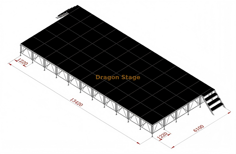 This professional-grade 13.42m x 6.1m (44ft x 20ft) outdoor mobile stage by Dragon Stage is engineered for high-load, large-scale concerts, festivals, and events. It features a robust 6061 aluminum alloy frame, an integrated lighting truss for audio-visual rigs, and customizable surface options, all designed for rapid assembly.